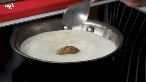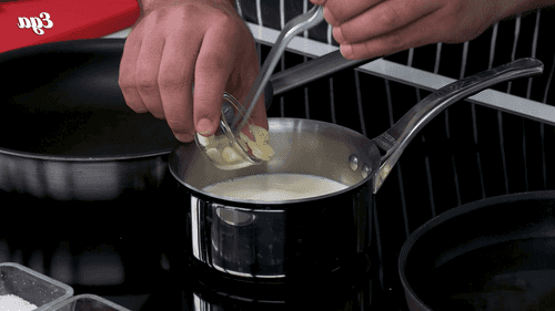 Slightly cool the milk, strain it, return it to the saucepan, place it on the heat, add the flour roux and, whisking vigorously, bring to a boil.