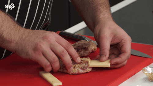 Make a horizontal cut in the chicken fillet, not cutting through the meat completely. Insert a slice of Gruyère cheese into the cut.