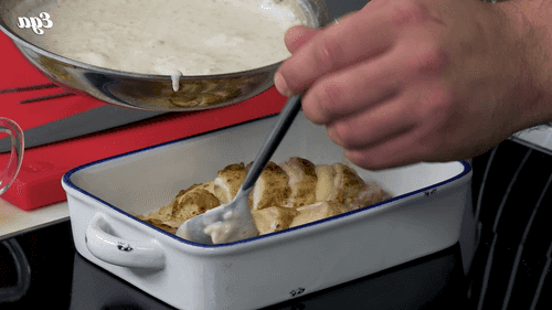 Take the dish, add béchamel (160 g) so that the sauce does not cover the chicken fillet. Return the dish to the oven for another 5 minutes.