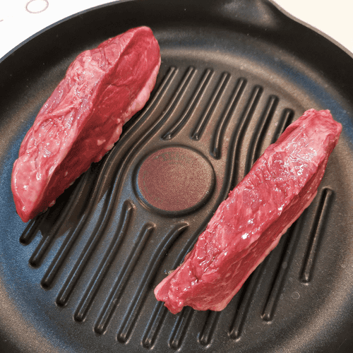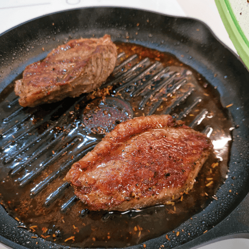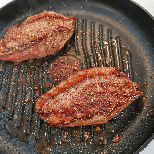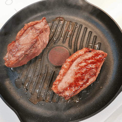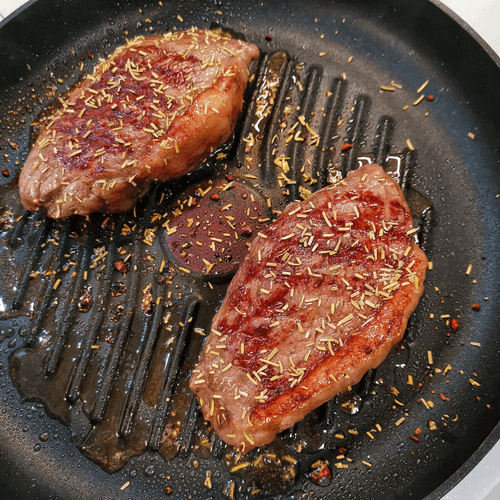 After 2-3 minutes, place the steak on its side. Continue frying on high heat.