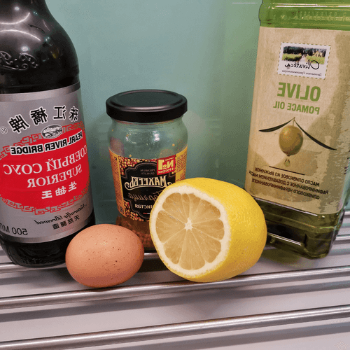 Combine oil, lemon wedges, mustard, egg, and soy sauce in a blender.