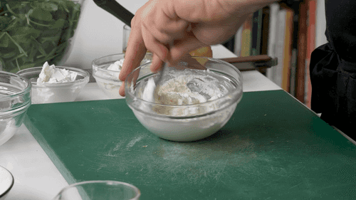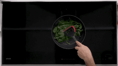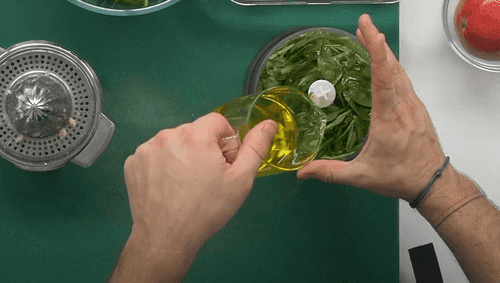 To make sautéed spinach, heat a pan, add some nut oil, 70 grams of spinach, season with salt, and sauté for 2 minutes while stirring.