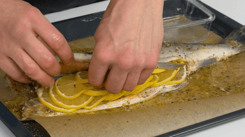 Stuff the fish's belly with lemon slices and refrigerate for 30 minutes.