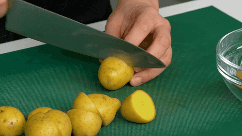 Cut the potatoes in half without peeling and boil until half-cooked - 6 minutes.