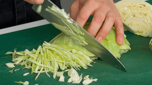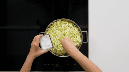 Add cabbage, season with salt and pepper, cover with a lid and simmer for about half an hour until the cabbage is soft. Occasionally open the lid and stir the contents of the pan.