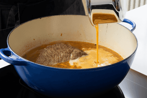 About 30 minutes before the cooking is finished, add 1 tablespoon of flour, sautéed with the same amount of butter until dark brown, to the meat. Stir and let it simmer on low heat until ready.