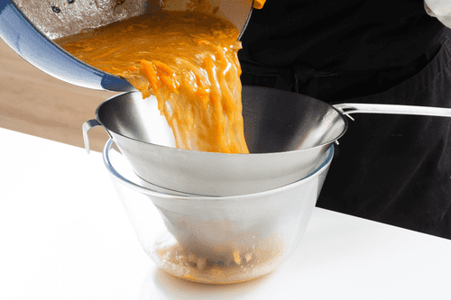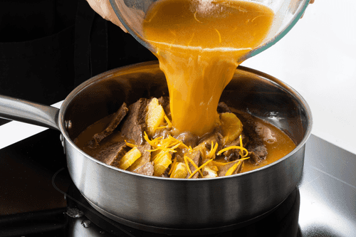 Strain the sauce obtained from braising the meat, add orange zest cut into very thin strips and blanched for 1 minute in boiling water.