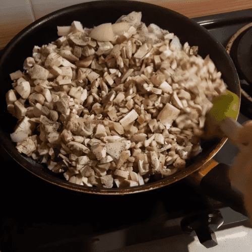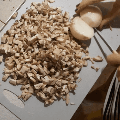 Grate the cheese and boil 3 eggs. Cut the eggs and mix with the mushrooms.