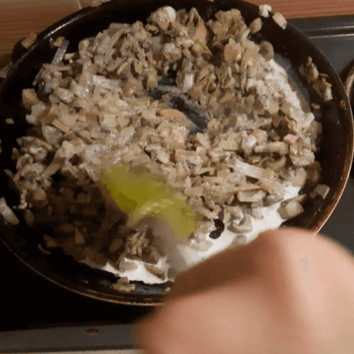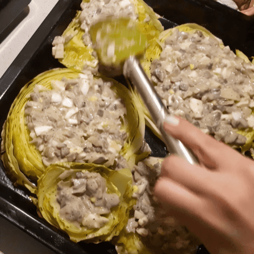 Place the mushroom filling on the prepared cabbage and put it in the oven at 180 degrees. After 10 minutes, add cheese and bake for another 3 minutes.