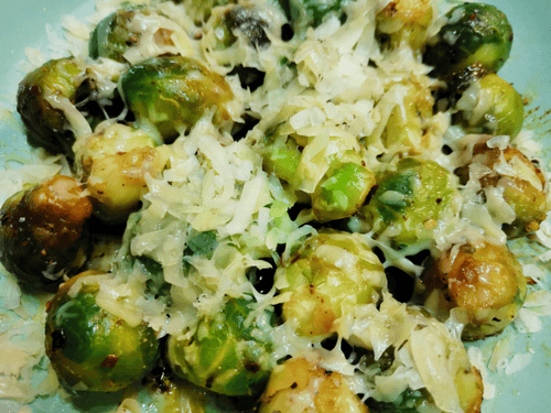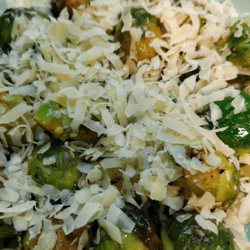 Brussels sprouts in a frying pan with cheese