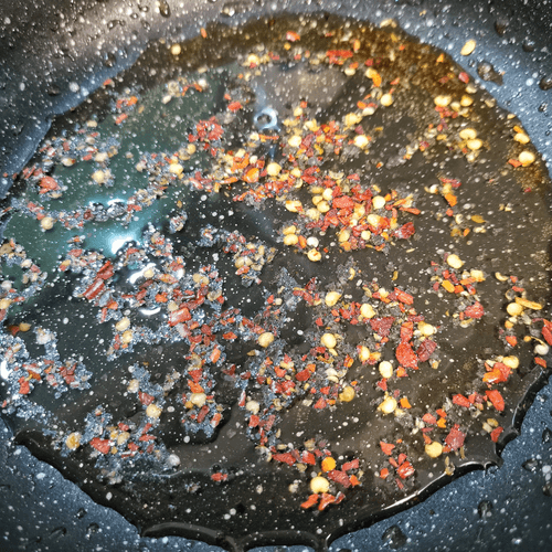 Heat oil in a pan with a pinch of coarse salt and chili flakes.