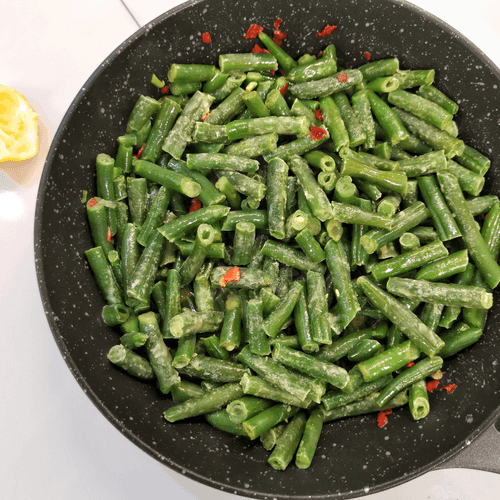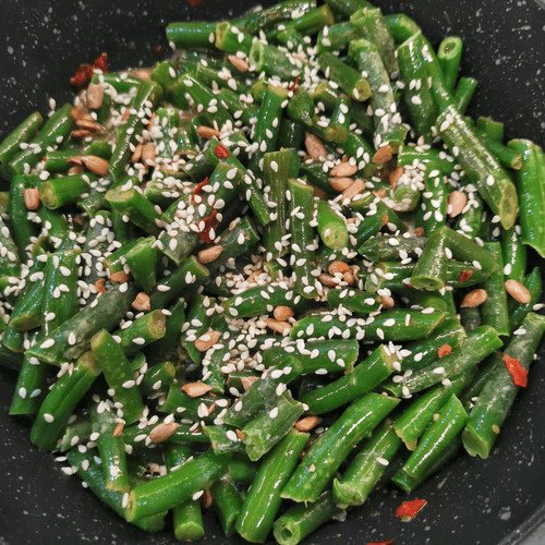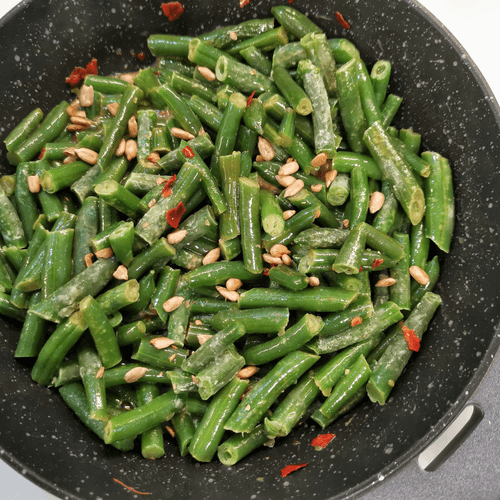 Green bean with cheese, onion, and garlic is a vibrant dish with a rich flavor and a hint of spiciness. Crispy green beans, aromatic leeks, and onions create a delicate yet rich taste. Chili pepper adds heat while lemon juice refreshes the composition. Roasted sunflower seeds and sesame provide textural depth, while nutmeg adds sophistication. Coarsely chopped garlic reveals its rich aroma combined with melted cheese that binds all ingredients into a tender and stretchy harmony. This dish is perfect for a light dinner, as a side to meat or as an appetizer on its own. It can be served warm or chilled, enjoying the contrast of textures and richness of flavors.