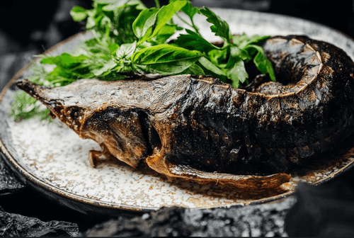 Wrap the sturgeon in a ring in a cast-iron skillet and send it to the oven at 180–200 degrees for 8–10 minutes.
