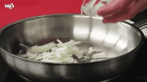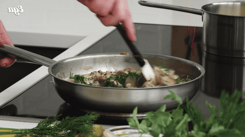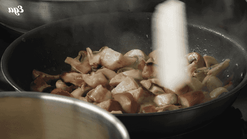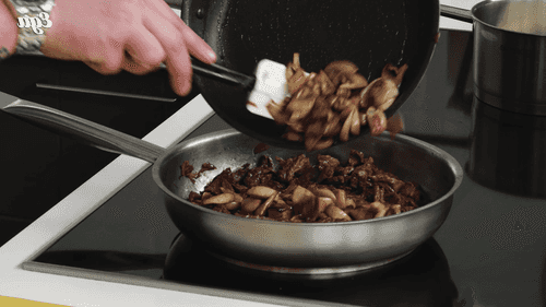 In a separate pan, heat oil over high heat and first fry the mushrooms for a few minutes. Add the white mushrooms, season with salt and pepper, and continue frying until golden brown.