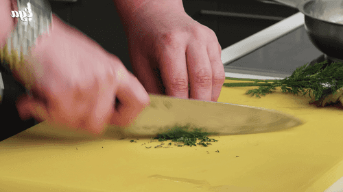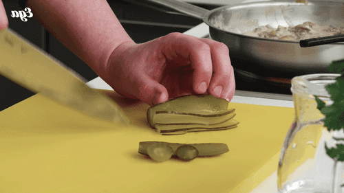 Serve the ready beef stroganoff with mashed potatoes, garnished with pickles and fresh dill.