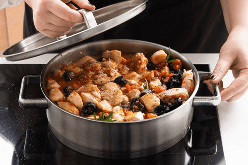 Add pieces of turkey, pour in the broth, add tomatoes with juice, crushed garlic, prunes, and rosemary.