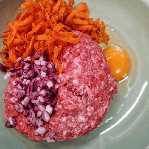 Combine minced meat, onion, carrot, and egg in a bowl.