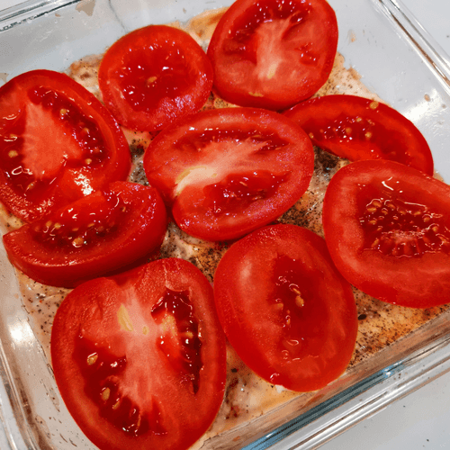 Cover with slices of tomato and sprinkle with salt.