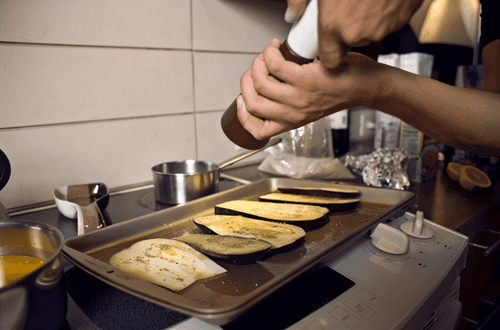 After 60 minutes, wash the eggplant, brush it with olive oil, and bake in the oven until golden brown.