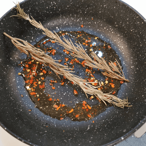 Heat oil in a pan, add a pinch of chili and a couple of sprigs of rosemary.
