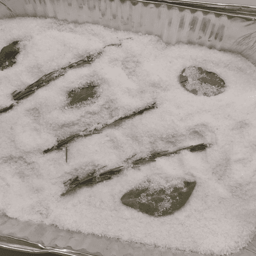Sprinkle salt in the baking dish, add bay leaf and rosemary on top, lightly dusting.