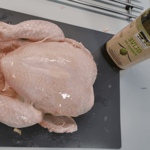 Grease the chicken with olive oil.
