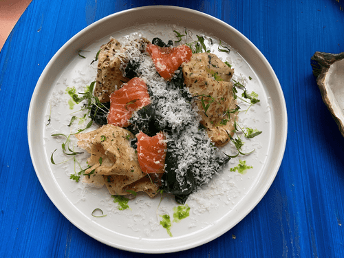 Pancakes with spinach and gravlax