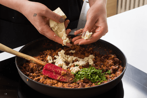 At the very end, add crumbled tofu and 50 grams of chopped cilantro (save a little for serving).