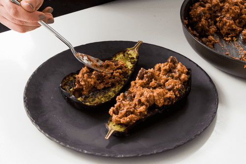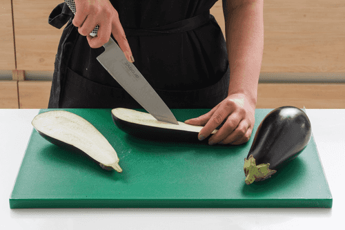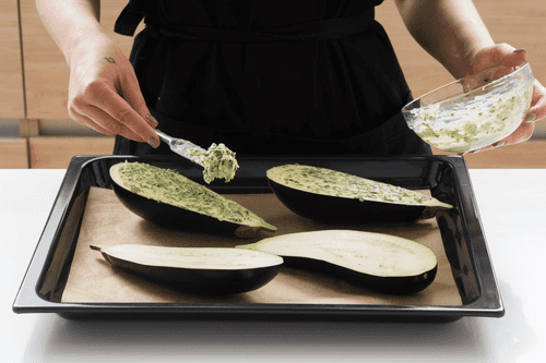 Cut the eggplants in half lengthwise. Make a deep cut along each half, not reaching the skin.