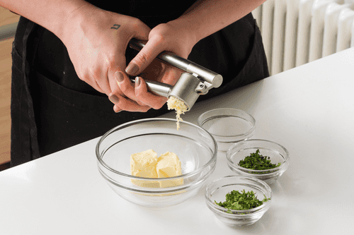 Mix softened butter with chopped cilantro and parsley, pressed garlic, and salt.