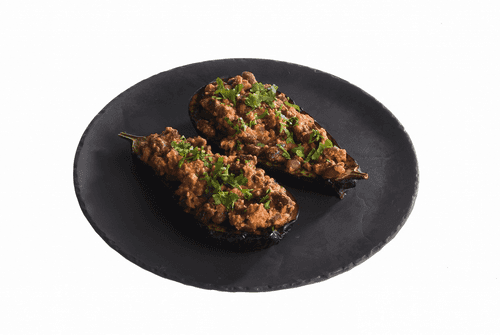 Spread this mixture on the eggplants like sandwiches, place them on a parchment-lined baking sheet, and put in a preheated oven at 200 degrees for 30-35 minutes until the eggplants are browned and soft.