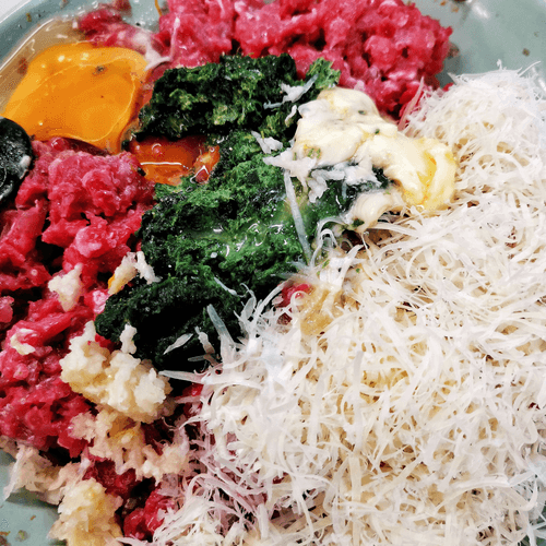 Add cheese, spinach, melted butter, and an egg to the minced meat. Squeeze in garlic and pour in the cream.