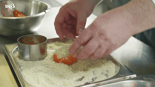Shape round patties and coat them in breadcrumbs. Place on a flat dish and put in the freezer for 1-2 hours.