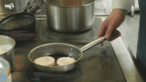Heat vegetable oil in a pan and fry the patties on both sides until golden brown. Then finish cooking them in an oven preheated to 195 degrees for 5 minutes.