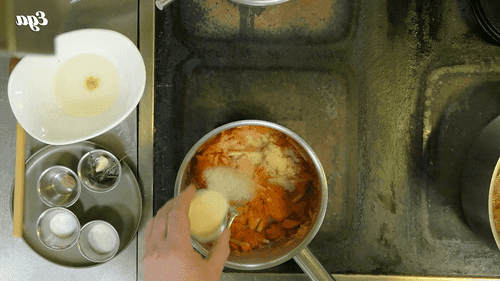 Add semolina and stir while keeping the saucepan on low heat. Add salt, sugar, nutmeg, thyme, and half a clove of grated garlic. Remove the carrot filling from the heat and let it cool.