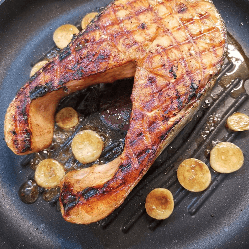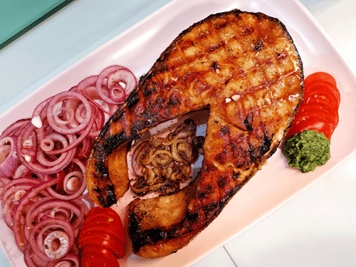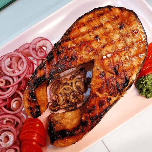 Salmon steak with pickled onions is an exquisite dish of French cuisine that combines the tenderness of fish with the spicy flavor of pickled onions. Salmon soaked in soy sauce and lime acquires a rich taste with light citrus notes. Shallots baked in marinade become soft and aromatic, while red onions soaked in wine vinegar add a pleasant tanginess. Grilling gives the steak an appetizing crust while keeping it juicy inside. The dish pairs perfectly with a glass of white wine and fresh vegetables, creating a harmonious balance of flavors. It is suitable for both festive dinners and romantic evenings, bringing elegance and gastronomic delight to your table.