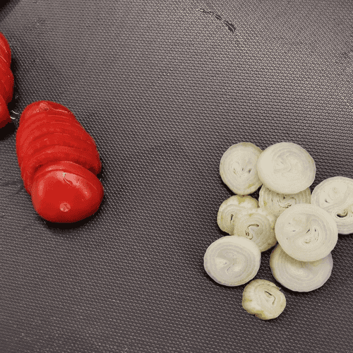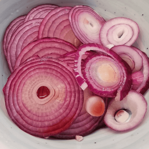 Slice the red onion into thin rings, place in a deep container, and pour in 2 tablespoons of warm water and 1 tablespoon of wine vinegar. Mix well.