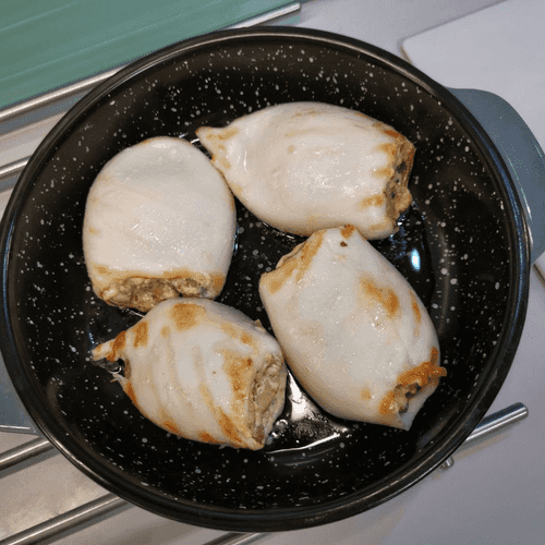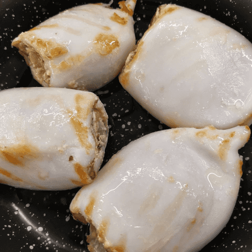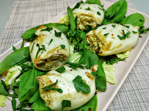 Stuffed squid with mushrooms and cheese is a gourmet dish where tender squid meat meets a rich mushroom filling enhanced with creamy cheese and aromatic parmesan. This recipe exemplifies modern author cuisine that combines sea and land products into a harmonious blend of flavors. Oyster mushrooms and shallots add pleasant texture and depth of aroma to the filling, while garlic and homemade mayonnaise enhance the composition with spiciness. Grilled squid is filled with warm, melting filling and baked to perfect tenderness. The dish is ideal for a festive dinner or romantic evening, impressing not only with its taste but also its exquisite appearance. Serve with light white wine and fresh vegetables to highlight the complexity of flavor nuances.