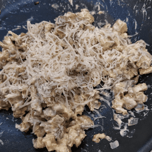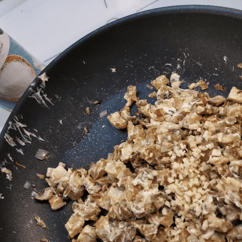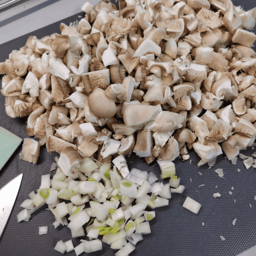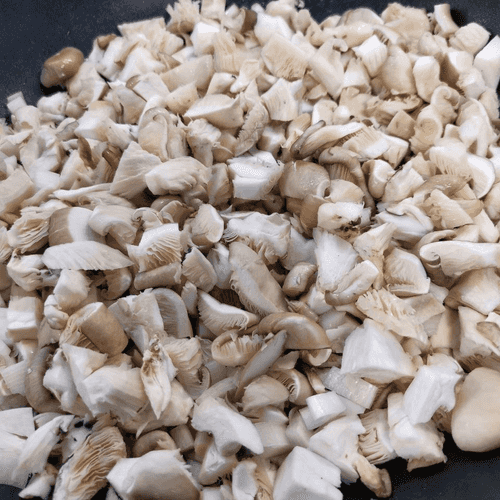 Melt butter in a pan and add the oyster mushrooms with onions. Fry on high heat for 5-6 minutes, stirring occasionally.