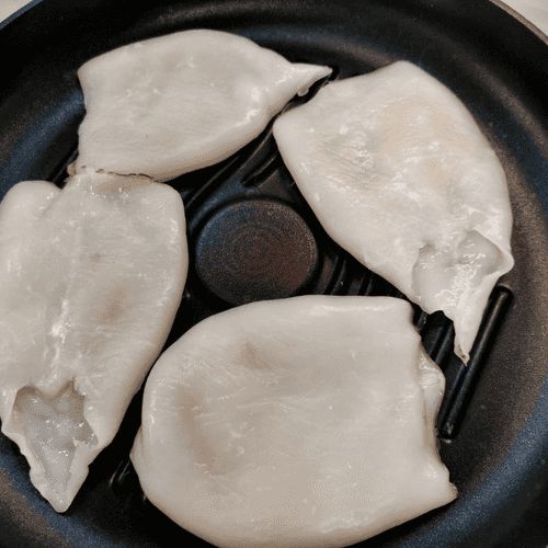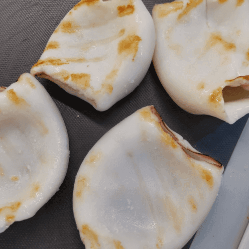 Place the squid on a dry hot grill pan. Fry for one and a half minutes on each side.