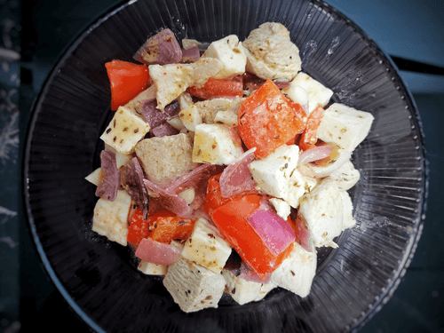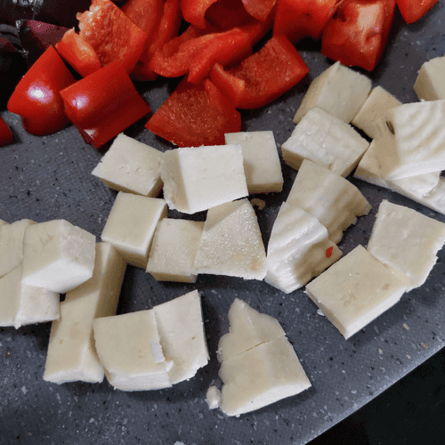 Cut the Adyghe cheese into cubes.