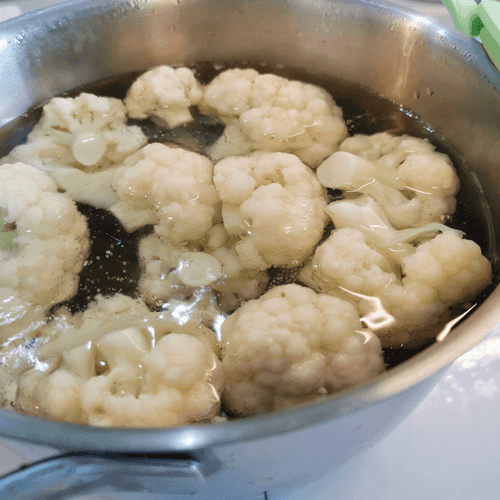 Add the cauliflower separated into florets to boiling salted water. After it boils again, cook for 10 minutes, then remove from heat.