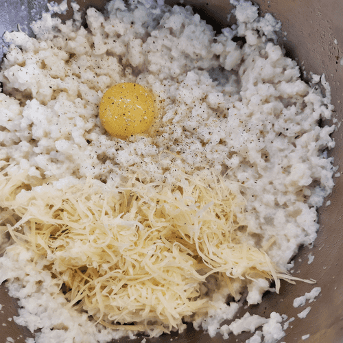 Add cheese, egg yolk, and nutmeg. Bring the mixture to a uniform consistency. Add salt.