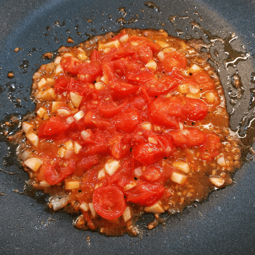 Fry the tomatoes with garlic in heated oil in a pan for 4-5 minutes, stirring constantly.