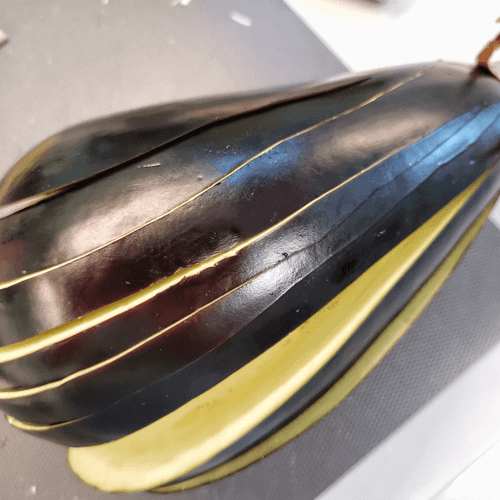Slice the eggplant about 7 mm thick, without cutting all the way to the stem.