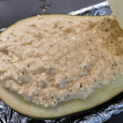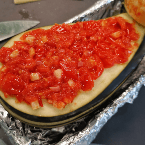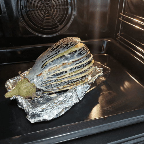 Place the eggplant in a baking dish lined with foil and bake at 190 degrees for 35 minutes.