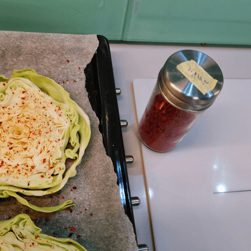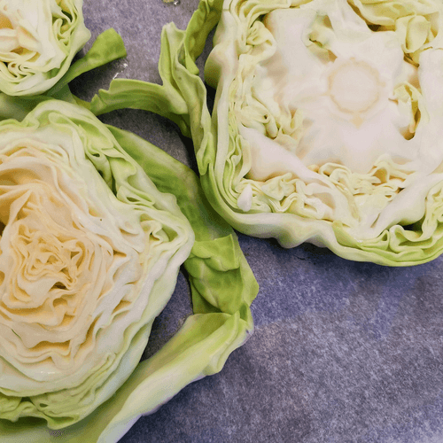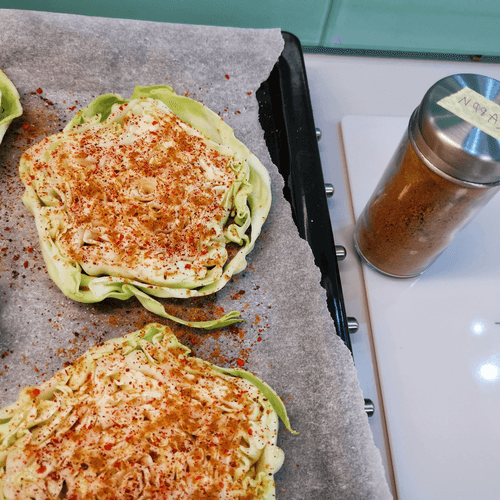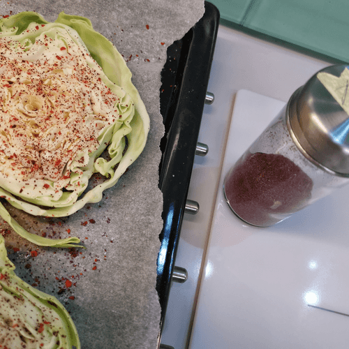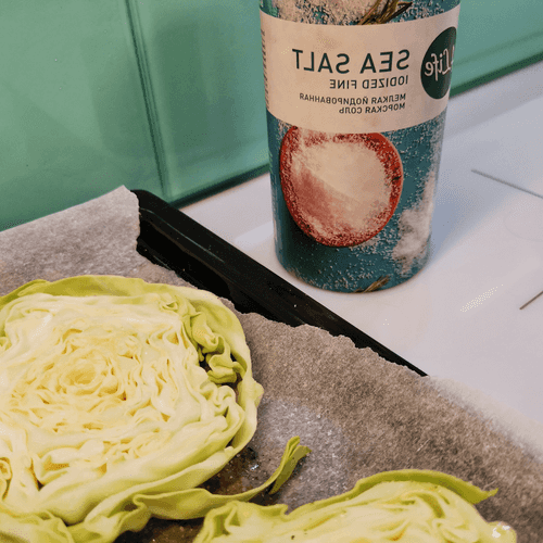 Place the cabbage on a parchment-lined baking sheet and salt it.