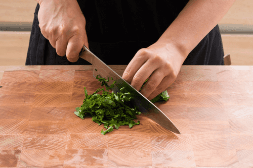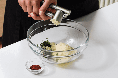 Then in a large bowl combine parsley, parmesan, and red pepper flakes. Squeeze in the garlic and mix.