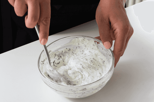 In a small bowl, mix sour cream, horseradish, and finely chopped dill.