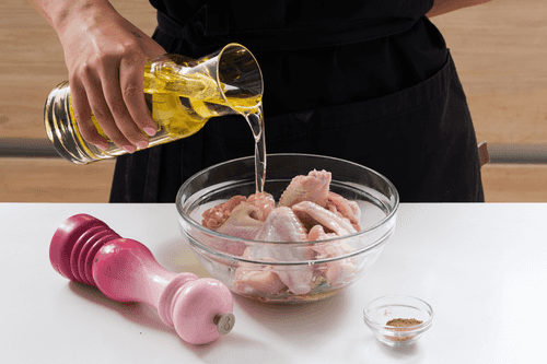 Place the wings in a large bowl. Pour vegetable oil over them. Add celery salt and black pepper. Set aside.